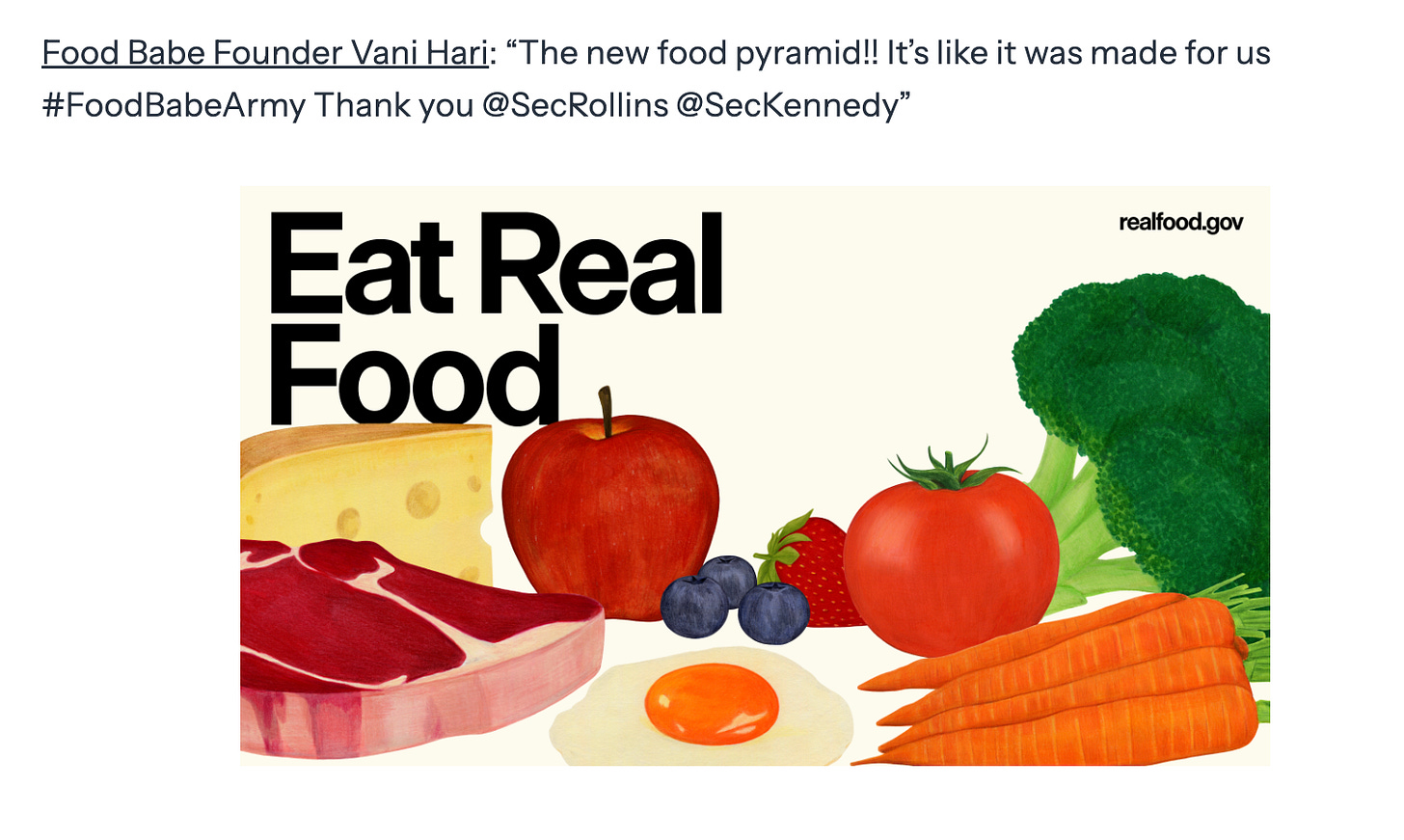 This is a list of quotes from “leading medical organizations, farmers, public health experts, and wellness advocates alike” about Trump’s healthy food initiatives, such as the one below.