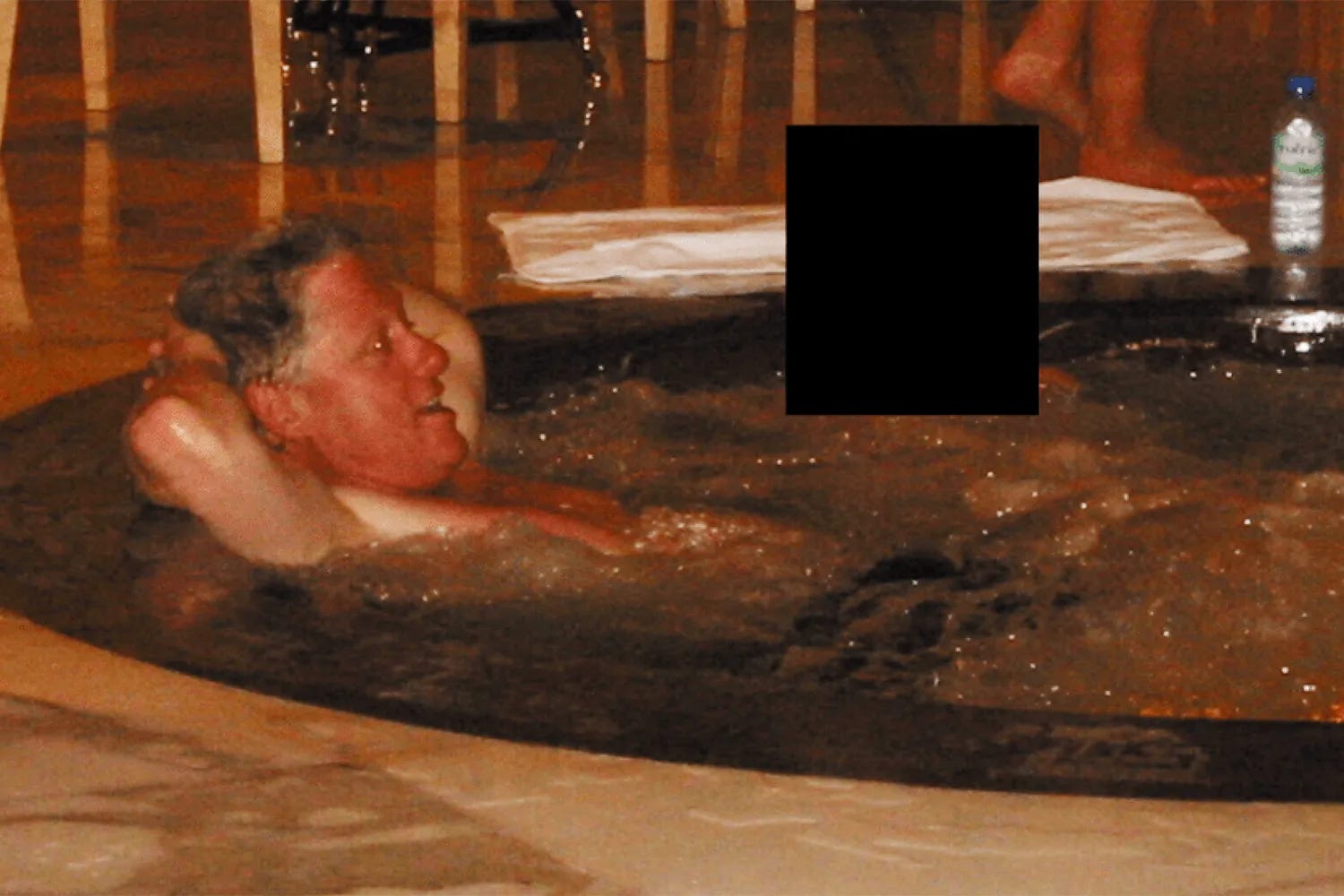 Bill Clinton, Ghislaine, and Jeffrey at a party, and Clinton in a hot tub